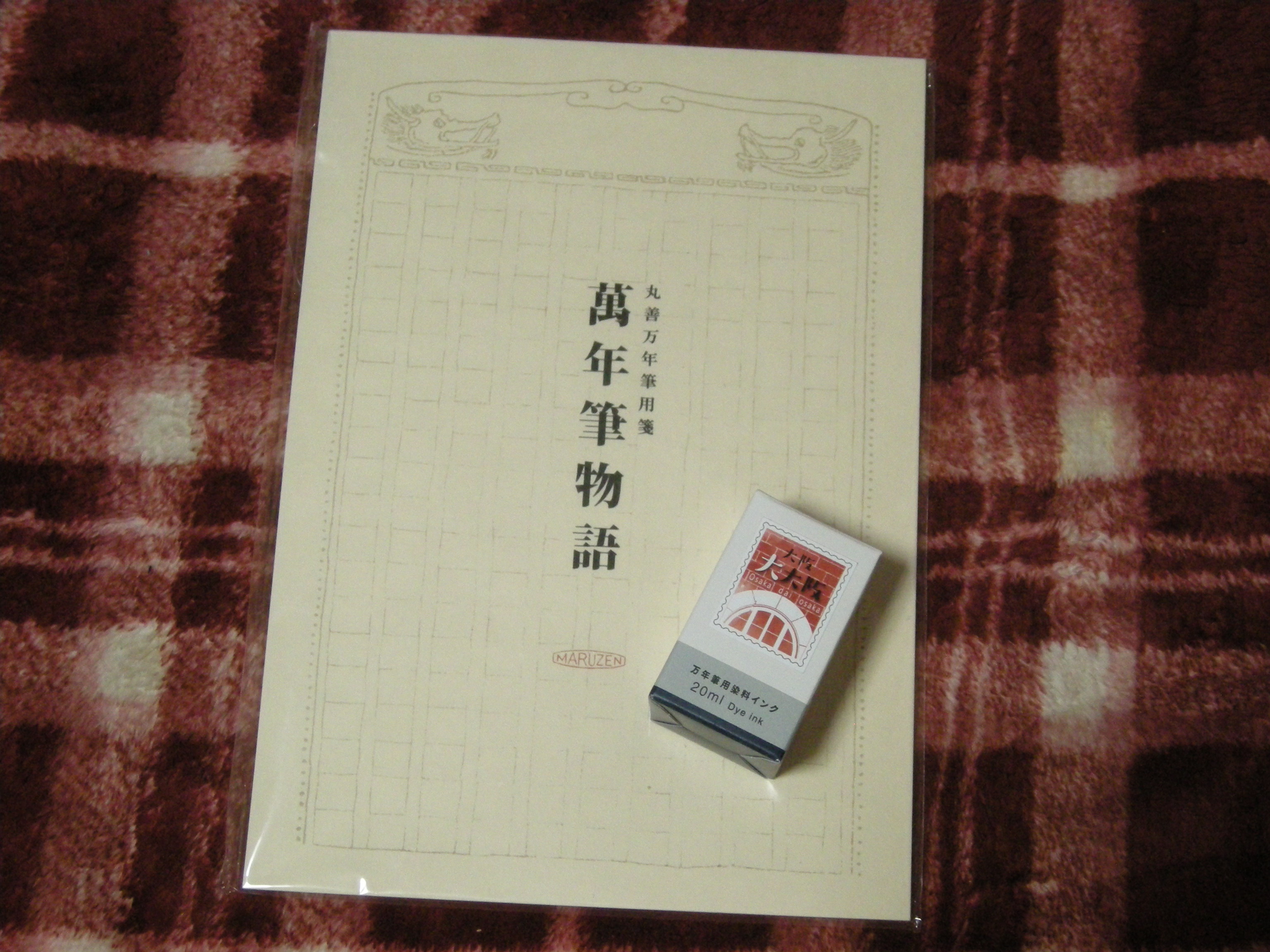 今回購入したのは万年筆用の便箋“萬年筆物語”と、丸善ご当地インクシリーズの“大阪 大大阪”です。丸善のご当地インクシリーズは日本橋店よりも多く取り揃えてありました。日本橋店で買った“岡山 藍染”はブルーブラック系の色でしたが、“大阪 大大阪”は赤!