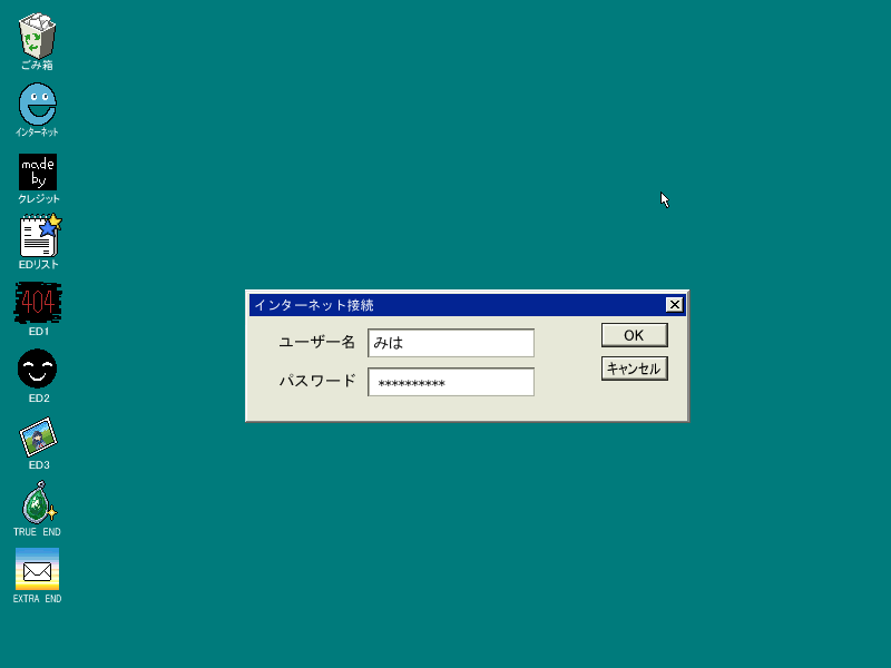 中々に凝っており、左のような某OSを模したダイアルアップ画面の後に表示されるとある個人ページの謎を解いていくアドベンチャーゲームとなっています。