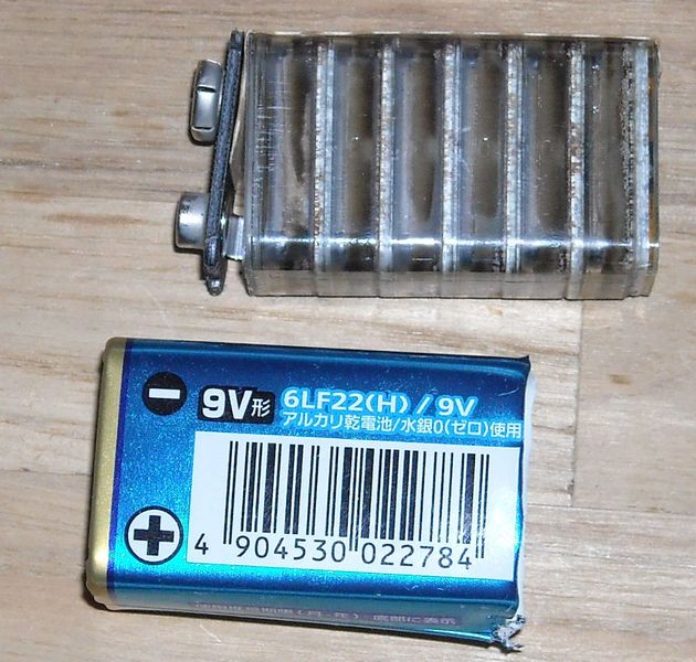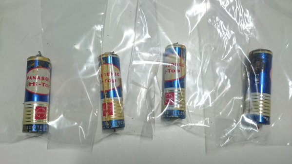 古いナショナルのライター型懐中電灯から出てきました。 JISは693となっており、紙巻+PVCチューブ、マイナス極はいつもの如く亜鉛缶むき出しですがプラス極は特殊形状となっております(後述) |