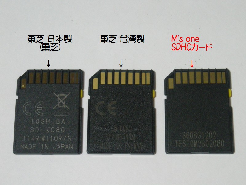 写真のSDHCカードはツルハホールディングス系のドラッグストアで売られているM's oneというPB品。 つい、絵柄が可愛いので買ってしまいました。カード自体は“KINGMAX”などのSDカードを発売する磁気研究所のもの。 ちなみにこのSDHCカードの商品紹介のページでは、 >>女性が手に取りやすい、くまのキャラクター入りのオリジナルデザインです。 見事に釣られてんじゃん。自分…。男だけどw。 プロテクトノッチが黄色いので、せめて台湾製東芝OEMかな?と思ったけど、どこのともわからんSDHCカードだった。 パッケージには「供給状況により、韓国・日本・その他のアジア諸国の場合があるけど、パッケージングは台湾なので、 パッケージには台湾製と表記している。(要約)」という実に曖昧な表記ですが、カード本体には原産国表示は無しで不明。 |