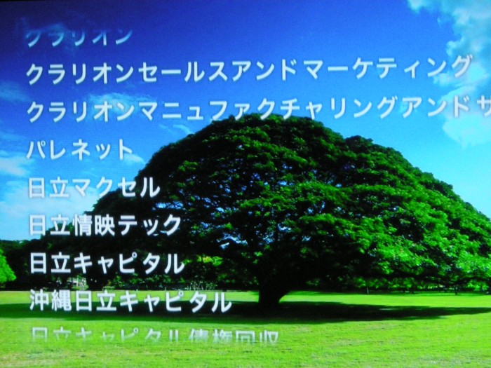 昨日の『日立 世界・ふしぎ発見!』で放送されていた“日立の樹”のクレジット。 表示の日立マクセルは2014年3月に親会社である日立製作所の子会社では無くなりましたが、 引き続き日立製作所が33.3%を出資する関連会社として掲載を続けているようであります。 ちなみにこの“日立の樹”のクレジットは一定の法則に則って並んでいます。 例えば、この写真を例に取ると、消えかかっている“クラリオン”から“パレネット”までが 日立オートモティブシステムズ関係の会社、“日立マクセル”と“日立情映テック”が 日立マクセルとその子会社、“日立キャピタル”以下が日立キャピタル関係の会社となっています。 つまりは各日立グループの会社とその関連子会社がまとめて掲載されているのです。 これを知っておくと、毎週のクレジットを見るのが面白くなるかもしれません。 |